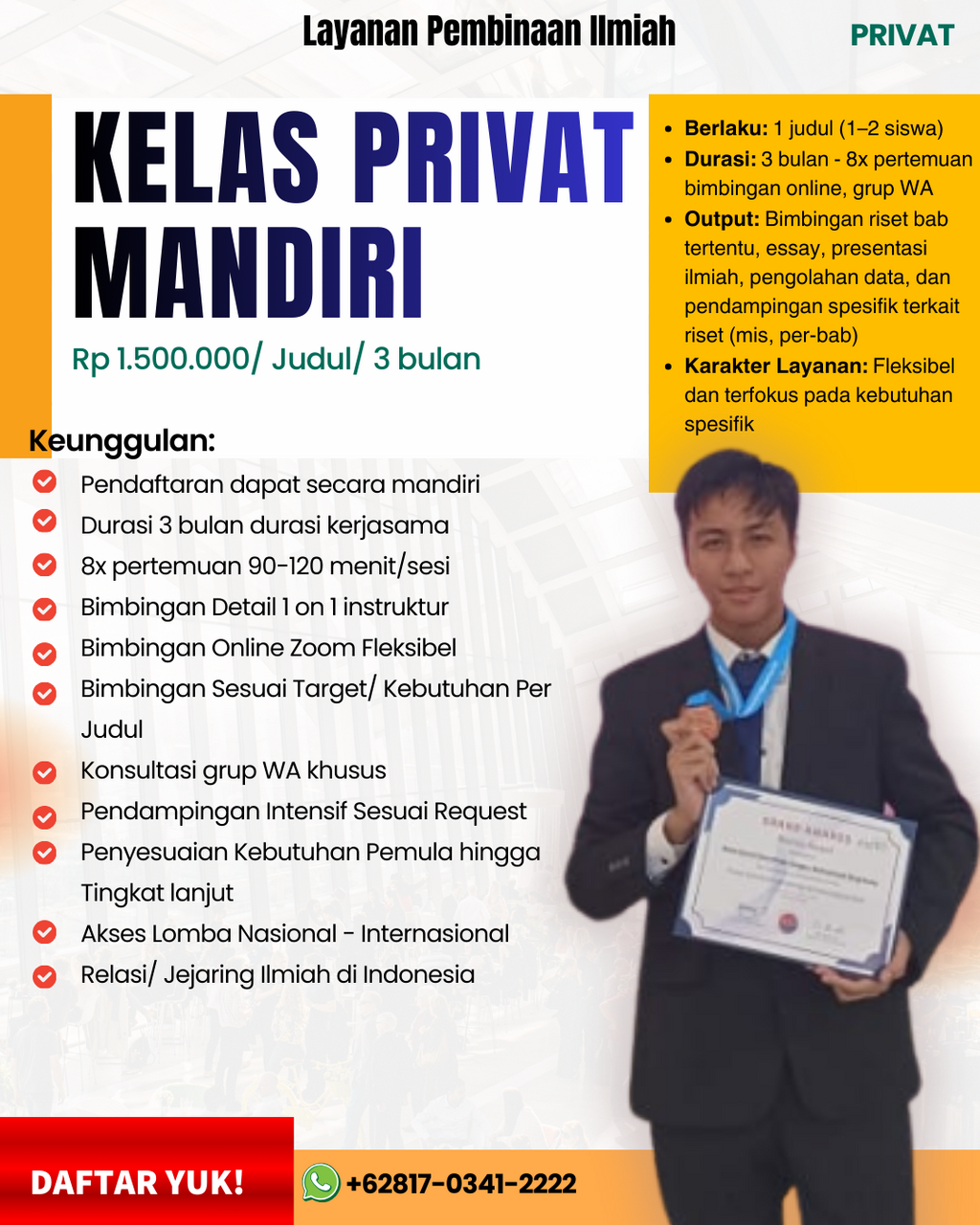 Mulai Rp 680.000 per siswa, dengan minimum 4 siswa/ 2 Judul dan maksimum 14 siswa/ 7 Judul. Durasi pembinaan intens selama 6 bulan.