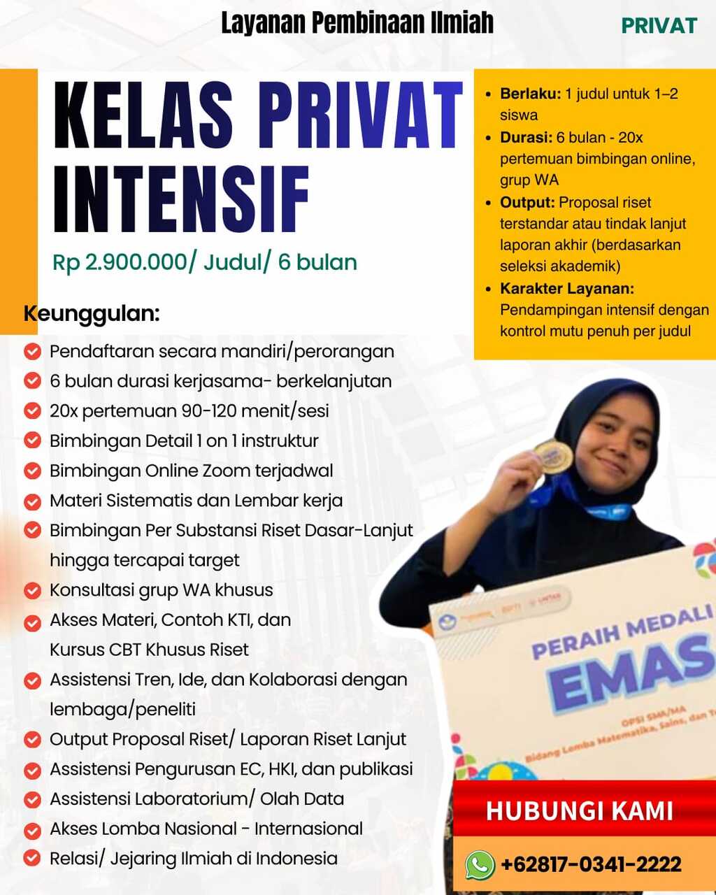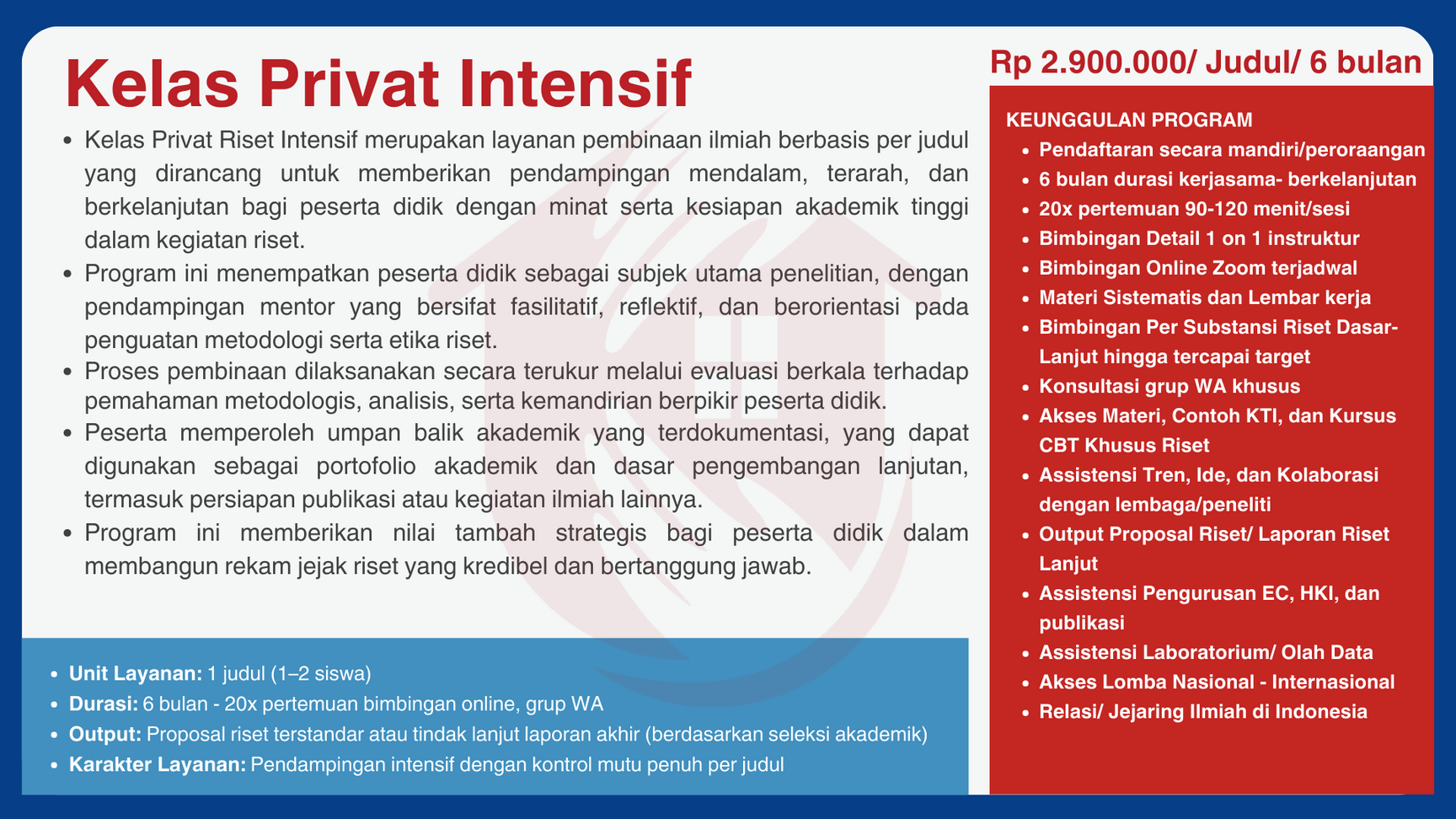 Kelas Privat Riset Intensif merupakan layanan pembinaan ilmiah berbasis per judul yang dirancang untuk memberikan pendampingan mendalam, terarah, dan berkelanjutan bagi peserta didik dengan minat serta kesiapan akademik tinggi dalam kegiatan riset.