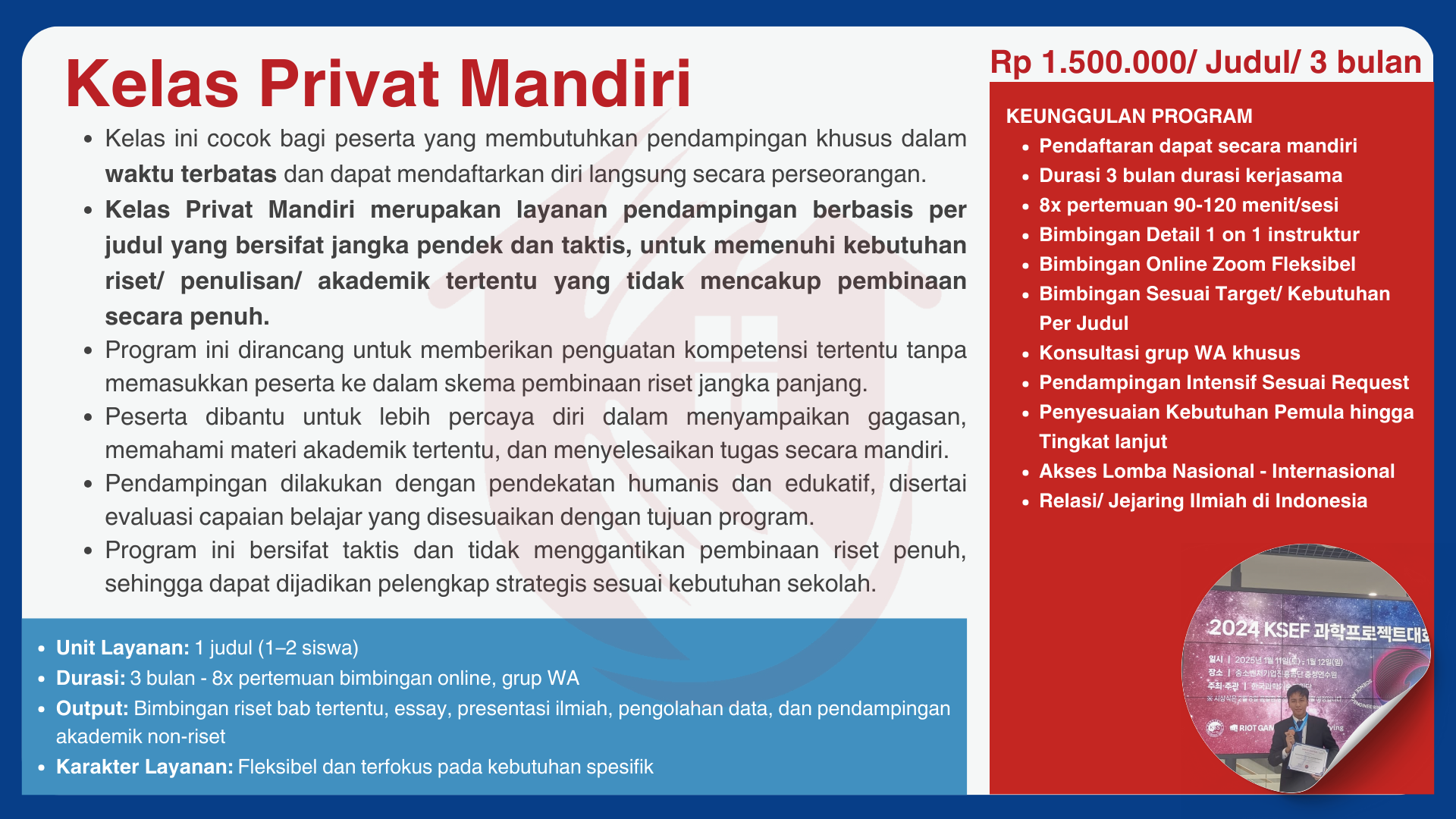 Kelas Privat Mandiri merupakan layanan pendampingan berbasis per judul yang bersifat jangka pendek dan taktis, untuk memenuhi kebutuhan riset/ penulisan/ akademik tertentu yang tidak mencakup pembinaan secara penuh.